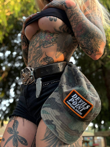 Devils Point Camo Dad Hat - Fall Edition. One size fits all. Adjustable velcro back. Devils Point heat transfer patch on front with hunters orange border